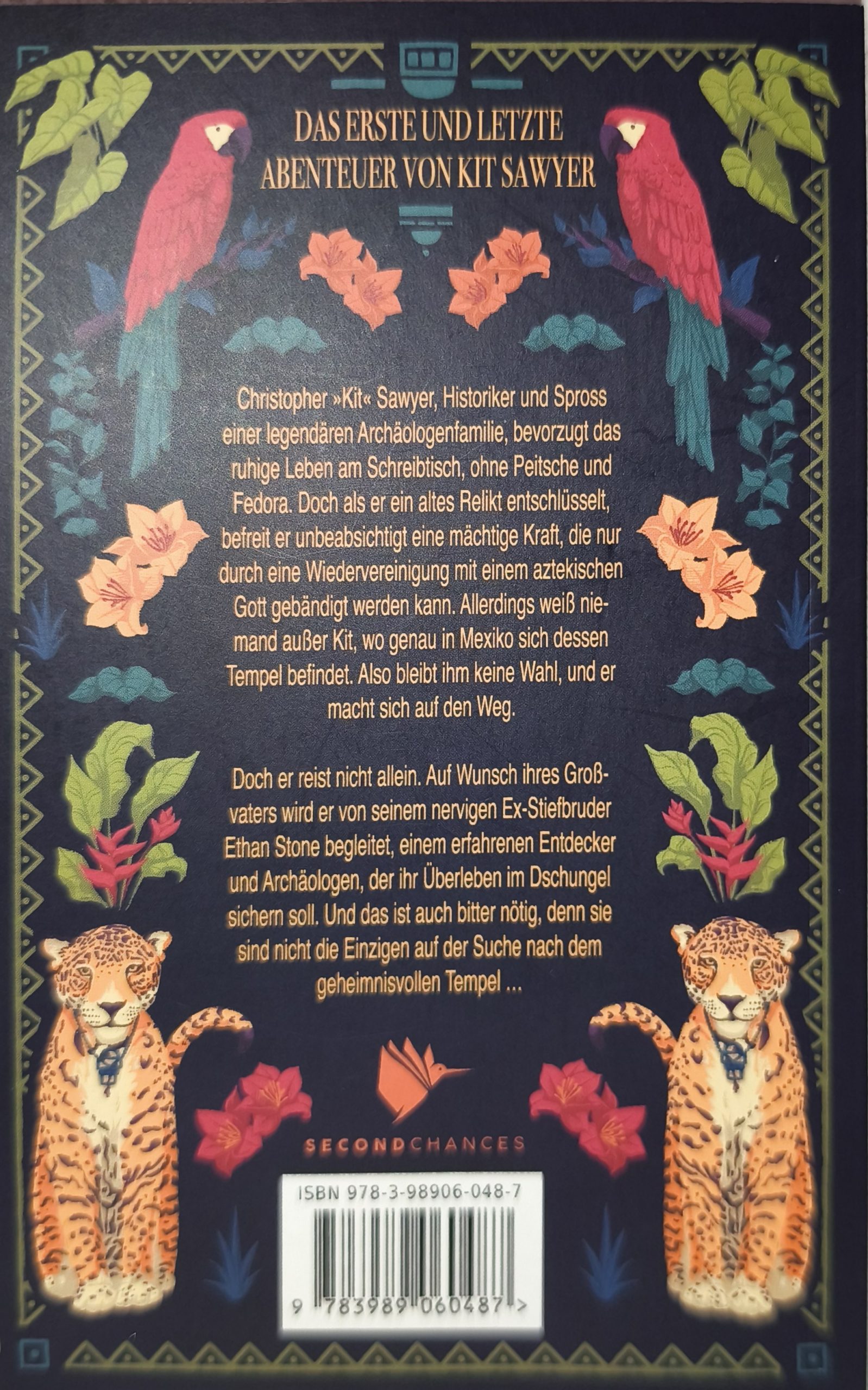 “Christopher »Kit« Sawyer, Historiker und Spross einer legendären Archäologenfamilie, bevorzugt das ruhige Leben am Schreibtisch, ohne Peitsche und Fedora. Doch als er ein altes Relikt entschlüsselt, befreit er unbeabsichtigt eine mächtige Kraft, die nur durch eine Wiedervereinigung mit einem aztekischen Gott gebändigt werden kann. Allerdings weiß niemand außer Kit, wo genau in Mexiko sich dessen Tempel befindet. Also bleibt ihm keine Wahl, und er macht sich auf den Weg.