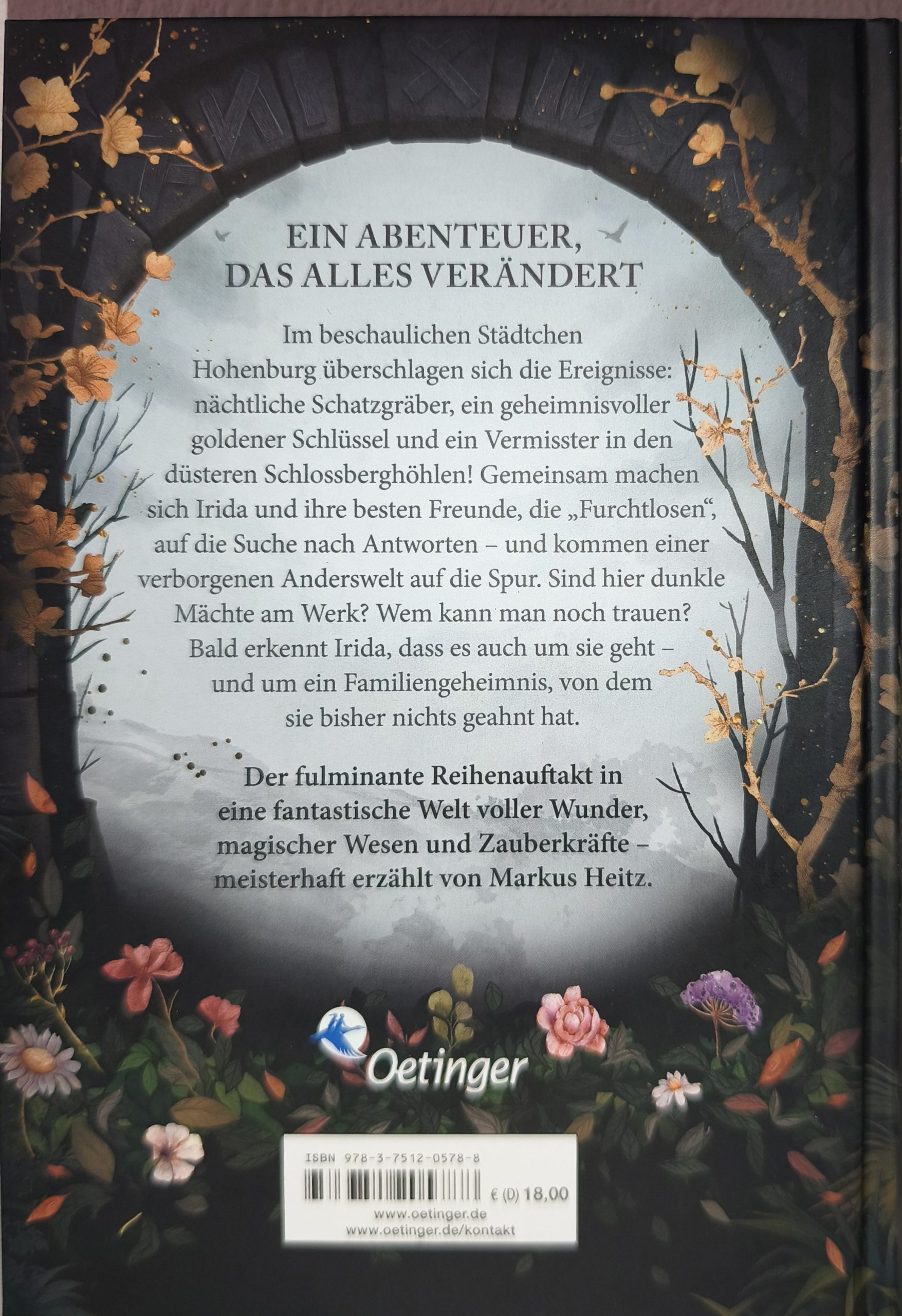 “Nächtliche Raubgräber im Maisfeld, ein rätselhafter Schlüssel und ein Vermisster in den Schlossberghöhlen – in denen es obendrein spukt! Irida und ihre Freunde, die „Furchtlosen“, gehen dem seltsamen Fall im beschaulichen Städtchen Hohenburg nach. Die mysteriösen Ereignisse führen Irida auf die Spur einer geheimen Anderswelt – und von bösartigen Wesen, die als Menschen getarnt unter den Einwohnern leben. Woher kommen sie? Was haben sie vor? Ist das mystische Reich in Gefahr? Irida und ihre Freunde wissen bald nicht mehr, wem sie vertrauen können. Und dann gibt es da noch ein allgegenwärtiges Kaninchen…