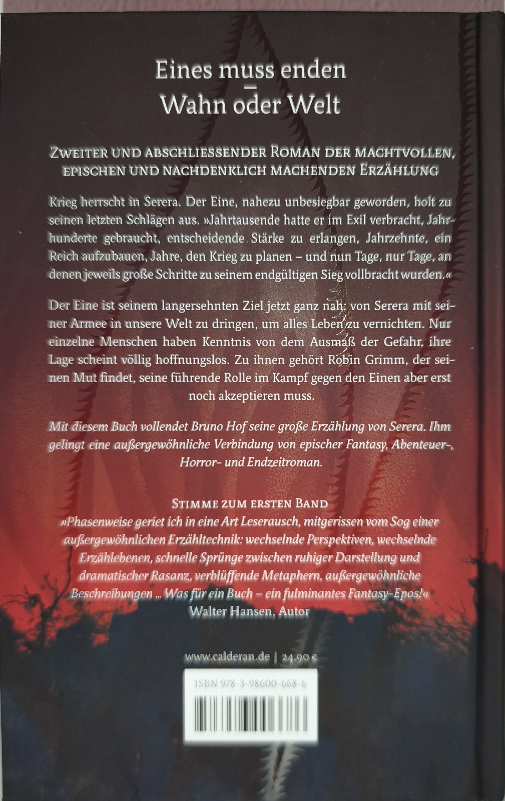 In »Die zwei Kriege«, dem zweiten und abschließenden Band der »Serera«-Erzählung, entfaltet Bruno Hof ein atemberaubendes Finale voller Magie und Kraft, Kämpfe und Machenschaften, Leid und Überlebenskampf, emotionaler und gedanklicher Tiefe. Die Handlung führt Leserinnen und Leser in eine Kulisse, die von verzweifeltem Mut, alten Mythen und den Abgründen der Menschheit durchzogen ist.” (Quelle: Calderan)